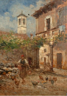 卢乔·托代斯基尼(Lucio TODESCHINI)的作品《庭院内经》再现了老米兰的街角和景观。《庭院内景》优美典雅,其中隐藏着细腻的诗意,因为托代斯基尼出生于米兰,其父亲是十九世纪末伦巴第地区的一名画家,所以他的风景画首先是老米兰的街角和景观以及末伦巴第地区的场景,他的绘画作品中总是透露着一种自然的趋向,《庭院内景》里所表现的喂鸡的质朴农家妇女,以及土色的楼房与围墙,土色的地面,蓝天白云与翠绿的藤蔓,一切都自然的无所修饰。整个画面单纯清新的蓝绿色调和朴素优雅、带有古典韵味的幽静气氛显而易见。托代斯基尼完全掌控了绘画的技术工具和十九世纪末伦巴第地区的景观色彩。但是害羞和内敛的个性从未表现出在他个人展示方面的兴趣,他从未将自己的绘画作品公布于世。正因为如此,他的作品在如今一画难求,极为珍贵。