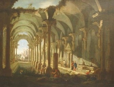 《那不勒斯公共浴室》描绘了在那不勒斯附近古代罗马公共浴池的场景,是幅极反应古罗马建筑特色的油画作品,经由1750年时吉奥里(JOLI)的画笔,重现了古代建筑风貌。Antonio JOLI(安东尼奥·吉奥里)是18世纪意大利著名的风景画家。他的画作如今被保存在世界各地的美术馆里珍藏。《那不勒斯公共浴室》重现了1750那一年的风情,是古罗马公共浴室的有趣代表之一,画中的浴室堪比宫殿,吉奥里把古罗马式建筑描绘的栩栩如生,整个浴室为覆盖方形的拱券结构建筑空间,拱顶的重量集中在四角的墩子上,无需连续的承重墙使得空间更为开敞。吉奥里细致的用画笔把几个十字拱同筒形拱、穹窿组合起来,覆盖了复杂的内部空间,顶部开放式的天窗设计,展现了古罗马人无穷的智慧。