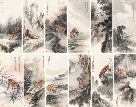《十二金钗图》是不可分割的整体,画中虎儿不同的形态,恰似每个独立的音符,而组合在一起后,却宛若一篇精彩乐章。配以背景的山峦、松柏、溪流、翠竹,使整个画面饱满而缜密。而张善孖更是借用这幅图,来表达自己的愤世嫉俗之情。