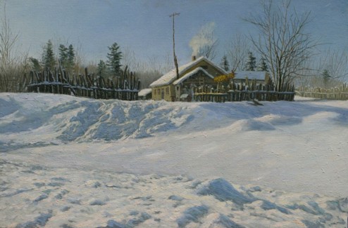 王春红的油画作品《雪中小屋》体现了中国画特有的形式美感,以写实的笔调,将风景的写意与生活的点滴完美的融合,犹如清泉般的情感细腻的流露。大片的雪景覆盖大地,纯洁美好另人向往,而雪与乡村的巧妙融合,让雪色多了几分生机,炊烟袅袅间一幅恬淡与安详的雪中景致非常的迷人。画家运用明暗与虚实的对比烘托出真实的乡村雪景。东北气息浓郁的村落景致被白雪覆盖,乡土气息浓郁,同样透露着恬适的生活氛围。