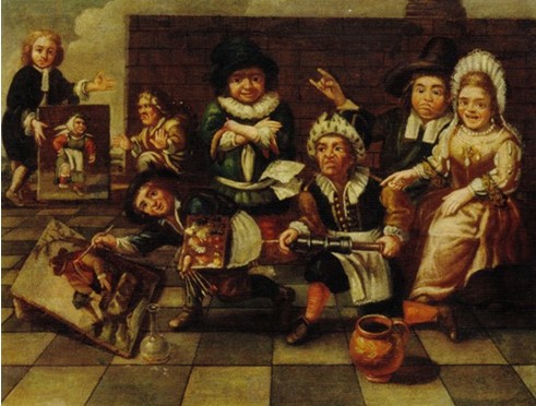 以童话故事《白雪公主》中七个小矮人为原型的古典派作品《寓意的场景》,是十七世纪下半叶和十八世纪初期克雷莫纳和米兰之间的伦巴第地区的经典作品。画家用具有讽刺意味的方式刻画了七个神态各异,表情生动的人物,他们的姿势各不相同,表情诙谐幽默,像是在欣赏一幅卡通片,作者以此来幻想着人们生活在一个幸福、快乐、滑稽的世界里,反映人们追求现世幸福的愿望。据了解这幅《寓意的场景》是巴黎美爵家族早在300多年前,根据民间传说《七个小矮人的故事》请古典绘画大师福斯蒂诺•博基Faustino BOCCHI创作的,至今仍收藏在巴黎美爵艺术基金。
