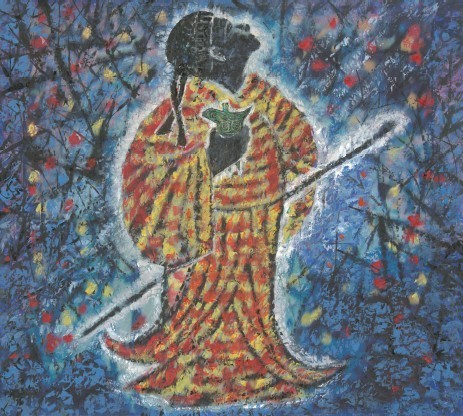 罗小华的这幅《把酒问青天》,灵感来自唐代诗人李白的著名诗篇《月下独酌》,整幅作品秉承东方审美传统和文化心性,又融合了西方色彩,是多种绘画风格和谐相融的佳作。粗看这幅作品,背景好似法国映像派的风格,和《孔子学说》的表现手法相似,以强力对比的色块让观者有视觉的冲击。再看李白,鲜艳的衣着用油画的技法表现,这样的技法在以往的中国古代绘画中难得一见。背景以蓝色为底,黑色线条随意勾勒,周身被黄与红两种色点围绕,貌似在表达诗人的思绪,看似杂乱,但富于变化和节奏,暗含了诗人丰富多彩的内心世界。为了突出李白的形象,罗小华将李白周身仿佛披上了月光的白,整个人物有了浮雕般的立体形象,更显飘逸灵动,体现中国哲学所特有的天人合一,虚静忘我的精神境界。
