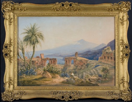 古典风景油画《小镇陶尔迷》是画家雅各布•苏特的作品,画面描绘了西西里小镇陶尔迷那一座始建于公元前三世纪的希腊剧院,作者带有情感的描绘了一派废墟的景象。在一座雄伟壮丽的大剧院废墟中,一个牧羊人正和他的羊群在这里稍作休息。剧院已经被印度无花果、棕榈树和许多地中海灌木所侵占,画家用淡雅的色彩和细腻的笔触为观众勾画了一副夕阳西下浪漫的风景油画。