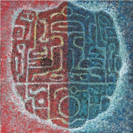罗小华除了选用饕餮纹这一古典纹路,在色彩上有着独特的创新和深厚寓意。画中的饕餮面具以红蓝色块一分为二,象征着“阴”与“阳”和合体,有一种“对立而不相抗”的文化象征。饕餮这种由两种或两种以上动物组成的神兽,本身也暗含着包容融合原则。罗小华同时也影射到现实社会中传统与现代的碰撞,善与恶的较量与抵消。画中所蕴含的种种哲理让走过知天命年龄的画家,学会了任何事物都有不同的两面性,并用艺术语言阐述给世人,学会修心,回归本真的生活。