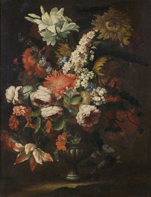 这幅画虽然几经易手,但是曾一直被长期陈列在罗马的王公大宅中。可以想象,这样一幅名作必定是被悬挂在殿堂中央,浓烈热烈的色彩传递着强烈的视觉辨识,繁复厚重的用笔让人忍不住驻足欣赏。玫瑰、百合、牡丹、风铃草和康乃馨,全部盛放在在一个色彩丰富、色调柔和的大玻璃花瓶里,画面的映射彷如当今的摄影技术。
