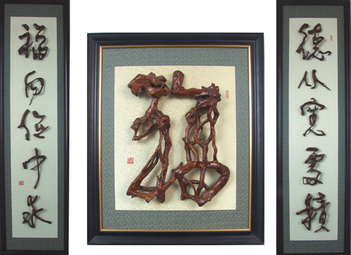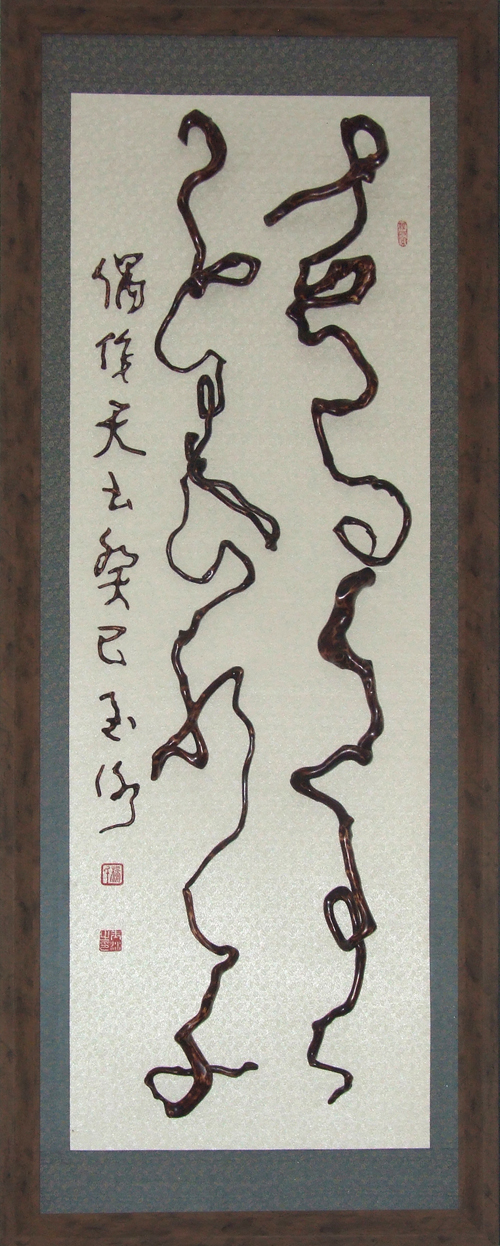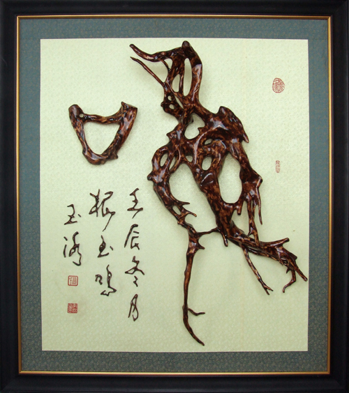 杨玉冰出生书香门第,自幼练习传统书法,从二十世纪八十年代开始对我国传统根艺进行研究与创作。在掌握传统根艺创作技艺的基础上,将我国“农耕文化”“传统吉祥物”“民俗风情”等人们喜闻乐见的题材及传统笔墨书法融入根艺创作中,形成了一门极具中国特色的根书法艺术。