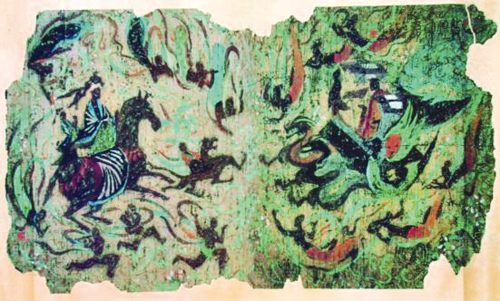 由此在现代重彩画《九歌》、《马球图》等的创作中,从古今文化的纵向源流和东西方横向的兼容借鉴西方现代观点和非洲黑人品原始艺术,吸收中国原始岩画、汉魏重唐彩壁画的艺术之精髓,融入儒、道、佛三种东方哲学的思想境界,以多种绘画手法,将各种形象的墨线与色彩交融变幻在一起,形成了一个新的奥妙领域,粗犷而不鄙野,浑厚而不凝滞,斑斑驳驳,浑浑沌沌,朦朦胧胧,极具抽象意义的朦胧意境的画面,透出了民族感情和哲理意识的内涵,寓示中国古老民族的一种沉静、淡泊而又神秘的精神回归。