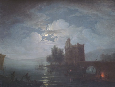 在夜景中的月夜题材一直被艺术家们所钟爱,夜晚的原野和河流在月亮的影射下显得十分安静祥和,它给人以宁静的感觉。在巴黎美爵基金收藏的《水面夜景》中可以看到这种意境。在这幅画中,一轮圆月在厚厚的云层中露出皎洁的身影,深暗色的河流中闪耀着粼粼的光波,观者仿佛可以嗅到蒙蒙的水汽,它犹如一首抒情的诗篇,摄动人心。远处的城堡具有神秘感和一种诗意感,近处河面上捕鱼的船只和渔民,以及点点灯火,又让整幅画面充满生活气息。
