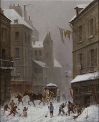 梅赫的这幅油画作品《雪后》描绘的是法国小城大雪之后,人民齐力扫雪的街景。从如铅的云层和厚重的天空可以看出,此时仍未放晴,冬风还卷着雪屑弥漫在城中。然而这样的画面中却处处呈现出生机,无论是挥舞的铁锹、扬起的马鞭,还是从窗边晾晒出的衣物,无比反映出那些劳动人民的乐观与活力,奔腾的马车和手拿雪铲的人们相映成辉,画作细致到连空气的质感都清晰明了,阴郁的背景与热火朝天的场面凸显了那种平凡而真实的魅力,让这幅现实主义的画作具有时代的深度和社会的广度,更加显得弥足珍贵。