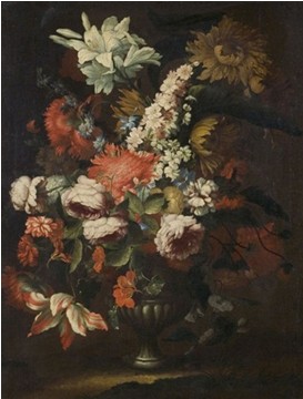 《花的光环》是弗昂·委内尔·翁·塔姆(Franz Werner von Tamm 1658–1724) 的作品,他是一位德国巴洛克风格的画家,在罗马因花卉和猎物的静物作品而闻名,中年时期被邀请去维也纳担任宫廷画家直到逝世。他的作品展现了18世纪初期罗马绘画的整个繁盛状况。《花的光环》描绘了玫瑰、百合、牡丹、风铃草和康乃馨,全部盛放在在一个色彩丰富、色调柔和的大玻璃花瓶里的画面。由于这幅画色彩明亮,极具装饰性,因此曾经被陈列在罗马的高大宅邸之中供人欣赏,它讲述着大自然的辉煌,展现了各种各样为我们所熟知的花卉。
