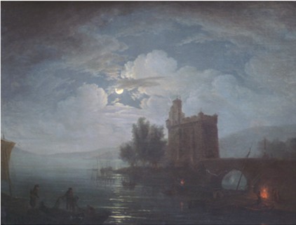 在巴黎美爵艺术基金的经典油画收藏中,不乏具有朦胧之美的著名油画。该基金收藏的一幅来自法国学院的18世纪油画《水面夜景》正有着梦幻般的朦胧意境。 整幅画描绘出一幅柔和、朦胧诗一般的画面。作者通过自己独有的对自然和人文景观的观察力、独到的表现力、精湛的技艺,把光、色、云、气完美的融合在一个和谐的色调中,表现出一种飘渺、朦胧的夜景效果。在这幅画中,一轮圆月在厚厚的云层中露出皎洁的身影,深暗色的河流中闪耀着粼粼的光波,观者仿佛可以嗅到蒙蒙的水汽,它犹如一首抒情的诗篇,摄动人心。特别是云层所透出的光线感,又让整个画面有了强烈的明暗对比,给人一种真实感觉的升华。远处的城堡和树木在月光显现出轮廓,近处反射着月光的水面上,有朦胧的灯火和渔船驶过,给人一种似梦非梦的神秘感觉。整幅画作所传达出的空间的纵深感,光与气的朦胧之韵,让观者沉醉在一种难以言传的美感之中。