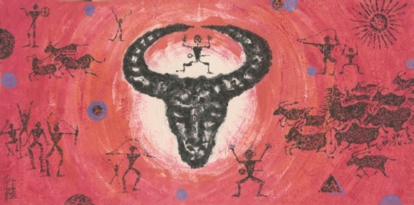 这是一幅描绘古代人来狩猎景象画作,在旷野的人们形态各异,有的拿着弓箭射猎,有的则手舞足蹈的吆喝着兽群。画面中间的牛头为祭祀的牺牲品,在古代牛为最高级别的祭物,而祭祀的对象为太阳。这里古人表达了他们对于太阳的崇敬,画面中心也可看为太阳。画面中红色所及的范围都是太阳能照射到的地方,也是故人心中太阳给予庇护和恩赐的地方。这是对这幅作品的解释之一。