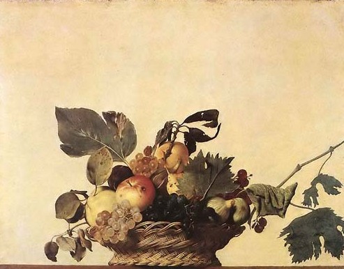 相比于雷米·艾融的静物画,卡拉瓦乔则将光还及于物,例如《水果篮》这幅作品,艺术史上从没有人以如此的视点,来画这样一个柳条篮筐并盛有带枝带叶的苹果、柠檬、桃子、葡萄和无花果的水果篮。这个水果篮置于一个平面上,不是很对称的摆着,一些略干的叶子,还有一些有斑点或者是坏了的果子盛放在其中。卡拉瓦乔让光线垂直照射主体,其他部分则在暗影里,以表现出强烈的明暗对比效果。卡拉瓦乔的这一风格让他的画作弥漫着迷人的神奇力量。卡拉瓦乔一生动荡不安,他的人生虽然短暂,但充满着神奇色彩,正如他充满着光影的绘画一样,他的人生也是“光影交织”赖人寻味,充满了诡秘紧张的喜剧情节。
