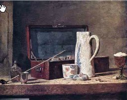 欧洲古代时期的古典静物画的构图一直多采用传统的黄金分隔比,以平稳的直线和稳定的三角形或矩形为框架,追求均衡安定的形式美感,平视的视角来表达安静而温情的画面。随着时代的发展,一些艺术家在古典静物画的基础上开始进行自己理念上的变革,让静物画不断以新新的形式呈现在观众眼前。其中夏尔丹的静物便是最具有代表性的作品。在《吸烟者的箱子》这幅作品中,画面朴实无华,一个木制巷子,一柄银制烟斗,白色瓷质杯子和瓶子成为最醒目的摆设,画面中完全没有刻意摆弄的痕迹,整幅画让观者的眼睛在从容的一点一点的移动观看的同时,又让人感觉眼前静物浑然一体。夏尔丹解除了传统的构图观念所孜孜以求的画面区域间的等级差别,这种差别规范和指引着视觉首先去注意最重要的区域,然后是等而次之的或第三位的区域,它给予所有的一切以同样程度的注意,所以,恰恰是因为来自画面其他区域的微妙压力,各个局部都在呈现在眼前时都显得引人瞩目。