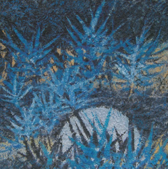 这幅作品以蓝色为主调,但其中的层次感和节奏感却并不单调。远景的深蓝色加上模糊的纹路,让背景更具有立体感和神秘感。画面中央错落有致的竹叶,在色彩的细微变化中呈现细腻的笔触和细节感,仿佛观者将视角聚焦于任何地方都难看的粗糙或者瑕疵。前景的月亮,让画面结构完整,让画面整体跳跃而富于节奏感。这样的视觉效果是罗小华融合多种绘画风格后创造的,融合也是罗小华作品一个不变的主题,这与她丰富的艺术经历有这密切的关系。