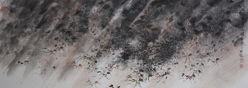 《兵蚁撼天图》系列,一群汇聚在一起的“兵蚁”像洪水暴发一样喷涌而来,把小小蚂蚁表现的与大山大水一样,有同样的震撼力,观者不得不被它浩大的气势吞没。在这个作品系列里,他巧妙地把山水的表现形式融入到了他的“兵蚁”系列中,以“兵蚁”为载体,用心灵创造理想的神境,而不是简单地摩画一个生物学意义上的蚂蚁物象。刘豫华的这种艺术创造在美术界与收藏界引起强烈反响。