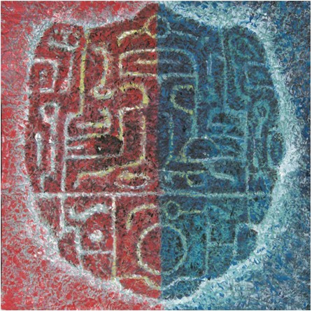 罗小华的《饕餮面具》在色彩上也有着藏戏面具的特征。在藏戏面具中,面具多设色,不同的色彩象征不同的角色特征。如深红色象征着正义的国王,蓝色代表反面人物,而半黑半白象征两面派等。画中的饕餮面正是以红蓝色块一分为二,象征着“阴”与“阳”和合体,有一种“对立而不相抗”的文化象征。饕餮这种由两种或两种以上动物组成的神兽,本身也暗含着包容融合原则。罗小华借用藏戏面具中的文化特征,为自己的艺术作品增添了丰富的文化内涵。