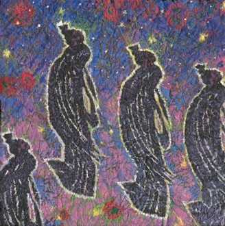 《圣诞》可谓是罗小华风格比较有代表性的佳作之一。融合始终为罗小华的风格符号,从这幅作品中我们也能窥见。类似西方油画与中国少数民族重彩画结合的背景,跳跃的选色配合以巧妙的色彩渐变配搭,表现出光怪陆离的夜空。这样的手法让整体画面充满观赏的情趣和细节感,在第一眼就能吸引住观者的眼球。同时作品中变幻莫测的天际也为主题服务,这是一种西方神话元素的表现手法。从画中的人物刻画手法上,罗小华大胆地采用中国传统水墨的笔法,且人物造型也和古画极为酷似。这样的结合正是来源于罗小华对东西方绘画深入研习的体现。作品中仿佛在描绘古代圣贤们夜观星象,占卜未来的情景。罗小华的多元化风格特点正是这幅作品的出彩之处,不但将东西方绘画技法相融合,从这幅作品中我们也能窥见东西方文化的交融,这正是罗小华多年绘画研习经历的体现。