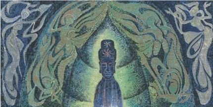 “飞天”作为中国敦煌壁画的标志性创作,代表了中国壁画文化的巅峰发展,也是世界非物质文化遗产重要的组成部分。在巴黎美爵艺术基金的推动下,旅法画家罗小华一系列关于敦煌飞天文化的作品引起了海内外关注,使得中国壁画文化再次登上世界的艺术舞台。这幅名为《飞天》的画作正是罗小华对于中国敦煌艺术最好的诠释。在本幅作品中,罗小华将中国古典的文化艺术与西方时尚的光效应用艺术结合在一起,创作出了蓝色调的飞天,同时也运用到中国的岩画艺术和古代装饰艺术结合的创作手法,画中所有的形象似成岩壁上拓印下来,却又拥有罗小华自身的艺术语言特征。佛身后的光晕渲染和对称式构图,使得整个画面和谐唯美,充满古典式的神秘与优雅。细观本幅作品,飞天的刻画更是精妙,她们身材修长,比例适度,腰姿柔软,绰约多姿,脸上形态不一。罗小华用《飞天》完成了中外吸收、融合的历程,形成了自己独特的风格,达到了艺术的顶峰,更展现了中国壁画艺术的精华之处。