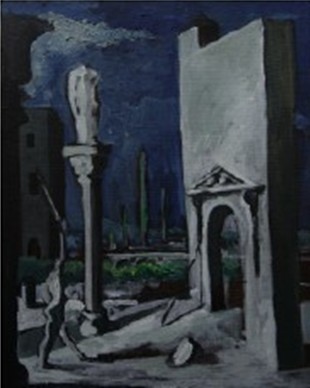《入口》是雷米·艾融颇具代表性的艺术作品,在硬线条的建筑物中,出现以弧线和曲线为主的人物,建筑物比例夸张大胆,使整个画面更具震撼力。作品以暗色调为主,在深浅不一的灰蓝色中点染部分暗绿色,整个画面看起来沉郁、厚重。在画面中,建筑物入口作为主要表现主题,在天空、建筑物、楼房、石柱等景物的映衬下,入口显得窄小而逼仄,尤其是在人物与入口之间,雷米·艾融设置了由低到高的斜坡,这一坡度,使人物张力倍增。