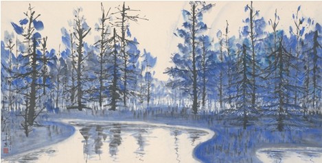 而巴黎美爵艺术基金签约画家罗小华的《蓝树林》创作于2012年,此时的罗小华,绘画技艺好似一颗珍珠一般,经历磨练,温润而内敛。《蓝树林》描绘了河边树林静怡安详的景色。在现实生活中,树林本无蓝色,但在罗小华的艺术视角下,所有树木均以蓝色调呈现在观者面前。罗小华在法国学习期间,深受法国印象派色彩的影响,对蓝色有着独有的情感,在本幅作品中,蓝色的运用恰到好处,正好衬托出“静”的主题,弯转的河流缓缓流过,河面投射出树木的倒影,整幅画面仿佛让观者置身某个晚秋或者初冬的树林中,四周寂静,只能听见河水的声音。乍看这幅作品,就能感受到浓郁的中国画风特点。枝干和大片的树叶都是写意画法,看似随意的笔法却是浑然天成的创作。但细细观赏,这幅作品同时又充满了细节之美,无论林间的草地,河中的倒影还是枝头的嫩叶都经得住仔细赏玩。