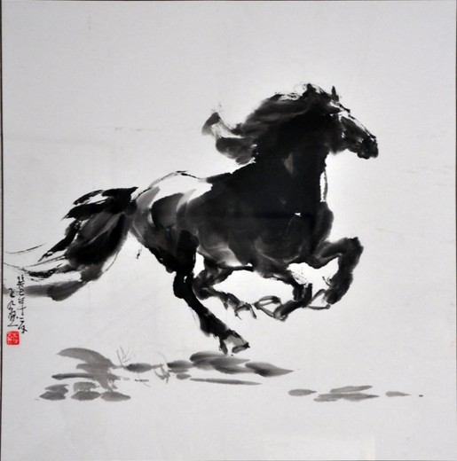图为五九先生在今年十一月所创作的奔马图,骏马处于一个奔跑的状态,豪迈洒脱, 马鬃和马尾在飞奔的状态下随风飘扬颇有军将之气魄,图中马的神态坚定,目视前方 ,苍劲有力,始终向着一个方向看,就像在表达着不到目的地誓不罢休的决心。画中骏马迎风奔跑,苍劲有力显然是一匹未被驯服的青壮马,在画家墨色浓淡交替的画法中骏马身上的每一块肌肉都能显现出力量之美。尤其是马蹄就像蓄势待发的拳击手,刚劲有力。画中显示了九歌的独特画法, 左手用笔干净利索,下笔精准 ,无半点拖沓之意。他在前人画马的经验基础上,将自身左手运笔的技法巧妙地融于中国水墨画法,在光影的变幻之中采用泼墨与线条的交融,以调整墨色的浓,淡,干,湿,焦,只寥寥数笔,却是笔走龙蛇,使画出的马给人一种奔腾向前,势不可挡的气势,体现出马的勇猛,力量和速度感,立体感。青壮马眼看前方神态坚毅,眼神锋利干练马韵则非凡脱俗,犹如置身于旷野之中目睹万马奔腾之雄壮。马的曲线如行云流水,尽显完美的曲线美,力与美的结合 豪迈和大气的磅礴之势。马的型,神,灵与魂在这幅作品中表现得淋漓尽致。