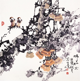自觉地选择文人画使朱贵祖把自己的创作纳入到中国民族绘画的体系中,而拥抱时代、拥抱人民、拥抱自然的真情厚意又决定了他不可能是传统文人的审美情趣,而只可能是充满健康向上的审美心理与眼光。这就是朱贵祖独具一格的性情以及对自己创作的影响。所以朱贵祖的花鸟画并没有一般文人画的雅逸和书卷气,更多的则是春意盎然、繁茂和谐、生机勃勃。