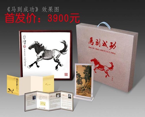 《马到成功》全套产品内含徐悲鸿《奔马》瓷板画1幅(带画框54×54cm)、徐悲鸿《柏马图》金箔画1幅(带台架13.5×25cm)、贵金属鉴定证书1张、收藏证书1张,采用美国牛皮卡纸包装盒包装。