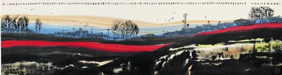 宋斌的中国画作品以乡情入画、斑斓入色,他的本次展览展出的宋斌先生精心创造的《雾凇山水》、《大树》、《中国红》、《中国蓝》、《五花山》、《咏鹅》、《小品》等系列经典作品。有竟显北国风光,千里冰封的冰天雪地、霜天无染尘的北国之美的《雾凇山水》系列作品;有大片成林,大雪覆盖而又坚强挺拔、毅力不到、枝枝向上的白桦林《大树》系列作品;有不拘泥于古法,随心而作,色彩生动、富有感染力,笔墨当随当下的《中国蓝》系列作品;有讴歌当下美好生活的《中国红》系列作品;有画面山河辽阔空远,给人以天苍苍野茫茫之感,秋染山川,尽展层林尽染之美的《五花山》系列作品;有中国文联副主席、中国美协副主席冯远先生给予高度评价 “古有羲之爱鹅,骆宾咏鹅,今乃有宋斌画鹅也!神形妙趣人皆喜之”。的《咏鹅》系列作品;有乡情浓郁,色彩斑斓艳丽,超凡脱俗,写生写真,格调高雅,独具匠心的山水画《小品》系列作品;此次展览非常全面的展示出了宋斌先生近几年来的精品力作68幅,作品《山幽尘远》,长6米,宽1.2米,以恢弘的气势描绘了北方的雾凇山水,近景松树枝干挺拔枝梢挂霜,冰雪初融溪水蜿蜒缓缓,农家小院远牧牛归来,中景云雾缭绕阶梯升腾,亭台楼阁如梦如歌飘渺虚幻,众鸟高飞空灵幽远,远景山雾飘远霜感十足。此图此情此景让人有远离红尘,远离喧嚣之感。