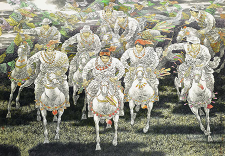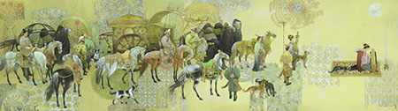(宋子涵 宋善娟 图\文报道)展览将于2014年4月8日10时在江苏省美术馆(新馆)开幕,本次展览是赵文元2013年11月份第二次在北京中国美术馆个展后的汇报展,由中国人民解放军美术书法研究院、南京军区政治部宣传部、江苏省委宣传部、江苏省文化厅、江苏省文学艺术界联合会、江苏省中华文化促进会主办,并由江苏省美术馆、江苏省美术家协会协办的一次大型个展。展出作品皆是赵文元2006年9月赴京举办的第一次晋京个展之后的新作,今年是马年,这次展出的作品,全部与马有关,工笔鞍马作品是这次画展的重点。其中有长达22米的巨幅工笔鞍马画《历代宝马图》,有十几米长的《烟花三月》,还有数十幅丈二以上的大作,如《丽人行》《一路祝福一路歌》《王昭君出塞》《三英战吕布》等等作品,还有一批大幅写意作品。如《茶马古道》《蕉林潇潇宝马归》《天路》《在那遥远的地方》等等。