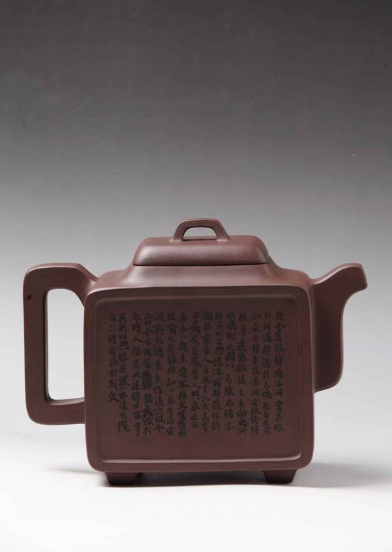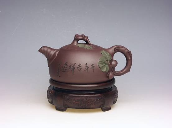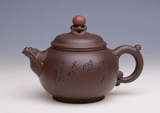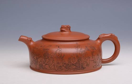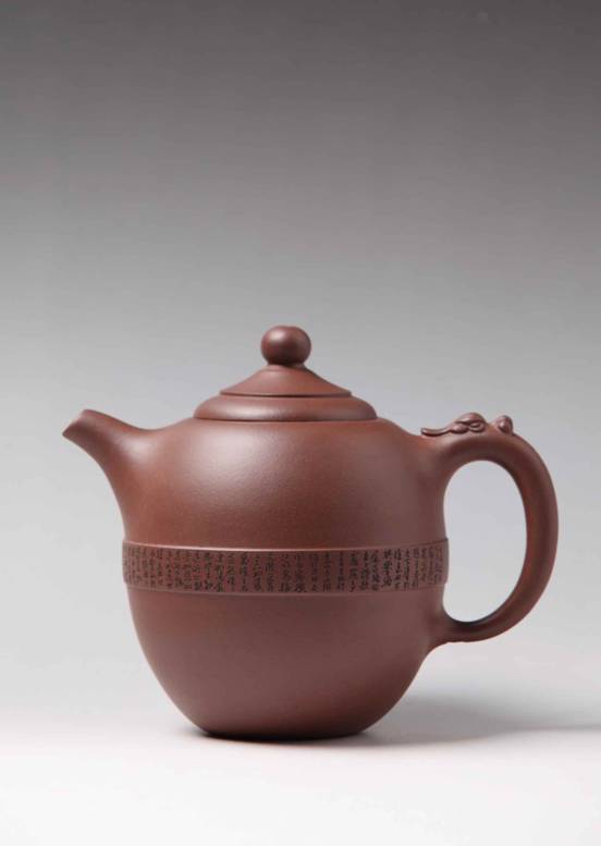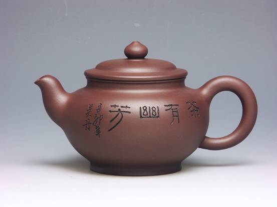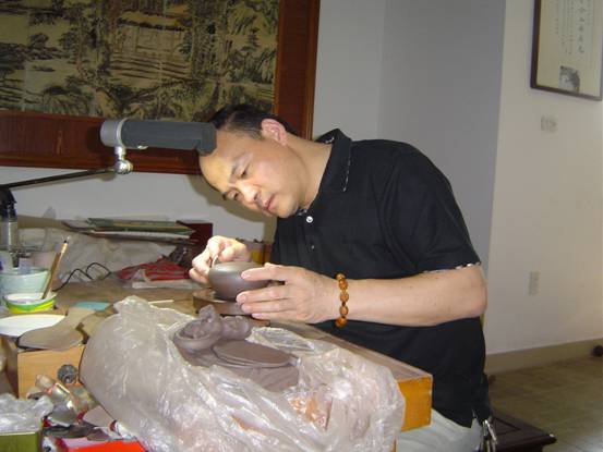 握住吴伟华老师的右手,明显感觉有点硌手而且食指与中指已经向一侧扭斜。他似乎感觉到了我的疑惑,不自然地打趣:“不好意思,那是老茧,做壶刻壶留下的纪念。”把手指都挤离了原位,那需要刻多少壶多使大劲?1963年出生的吴伟华老师,没有特别鲜明的个性,甘于隐忍则表示秉性倔强的另一面;待人处世随和、不卑不亢,坚守原则;除了制壶、刻壶以外,他的书法和中国画都已颇见功力;浅浅交往便可理解人们为什么说他勤奋好学谦逊踏实但骨子里还透着点儿小资的微微清高;读书无数宾朋满座揣着满腹经纶但没学会滔滔不绝.....想从他的言辞里了解关于他的信息确实有点很难。