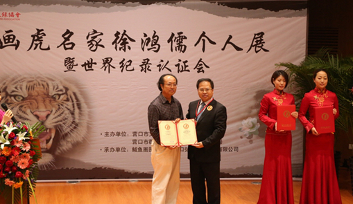 在本次画展上,由世界纪录协会委派的高级认证官张建先生为《百子闹春图》现场认证,经世界纪录协会认真核实比对,徐鸿儒先生于2007年3月至2012年10月在营口创作的工笔虎子画长卷《百子闹春图》,长19米,宽1.46米,整幅工笔画共画有东北虎虎仔100只,创世界纪录协会世界上画虎仔最多的工笔虎仔画长卷世界记录。