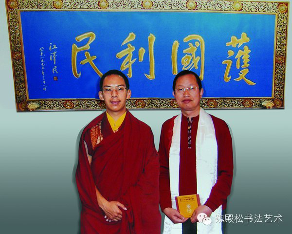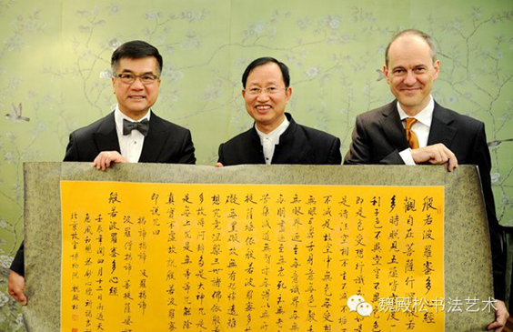 2012年11月9日,参加美国大使举办的珍.爱基金慈善晚宴,同美国大使骆家辉和英国大使吴思田合影。殿松书写的<般若波羅蜜多心经>成为慈善晚宴的亮点之一,并载入珍爱基金会的史册。