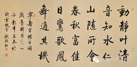 魏殿松先生作为身在故宫二十多年的书法家,故宫博物院丰厚的馆藏书法精品不断启迪他的艺术悟性、滋润他的书艺心田,使他的作品流露出深厚底蕴和皇家气派。他特别酷爱皇宫流行的“馆阁体”,在启功、刘炳森等书法大师影响和指导下,他坚持潜心研习历代名家之宝,潜心研读书法理论,书法作品气象正大、行云流水,受到众多专家和书法爱好者好评。