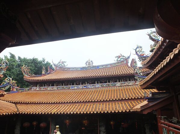 沿着木梯上二楼,皇家重阳谢三顶(普通宫庙正殿只有一级屋顶,慈济祖宫正殿有三级屋顶)富丽堂皇,黄色琉璃瓦金光闪闪,庙顶双龙戏珠欲抢欲让,灵动逼真,庙檐所雕珍禽贵木,亦静亦动,精美绝伦。