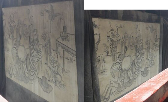 正殿背面精绘“神奇壁画”——“四顾眼弥勒佛”。壁画与庙同龄,在历史长河中弥勒佛笑口常开。无论你从哪个角度观赏他,弥勒佛和童子们的脸庞,身体始终朝向你,注视你。管理员解释说:“中国文化博大精深,八百多年前就掌握了立体画原理,而从唯心学上看,菩萨的注视警告世人,无论你身在哪个方位,菩萨始终都在注视着你。”