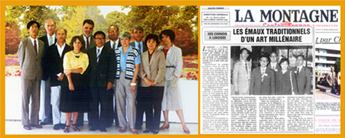 1984年,霍铁辉与法国里摩日市副市长、国际珐琅艺术家委员会秘书长吉耐尔先生合影及当时的报纸报道。