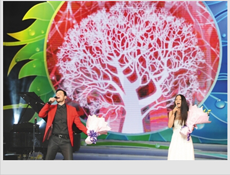 8月8日,由北京市青年联合会、北京俄罗斯文化中心、北京市外办共同举办的“中俄青年友好交流年”中俄青年艺术家专场演出在中国人民大学如论讲堂举行。 图为“中俄青年友好交流年”形象大使潘小芬(右)和俄罗斯歌唱家亚历山大合唱经典歌曲《喀秋莎》。