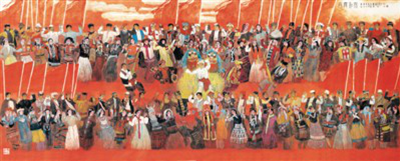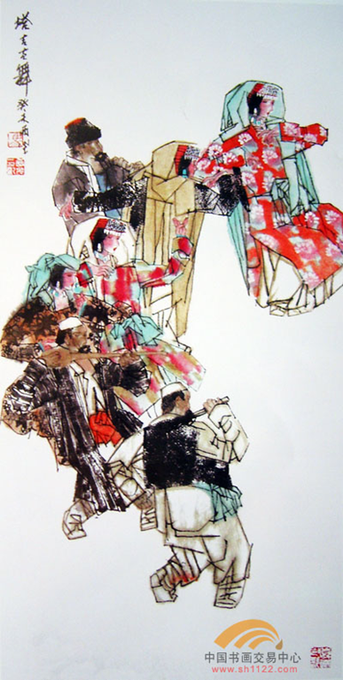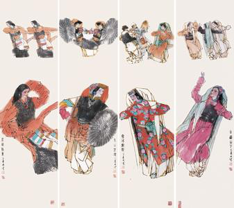 为表现高原人粗犷豪放的性格和藏族舞蹈震憾天地的气势,《高原之舞》开始画得比较粗犷,虽也画出了一定的感受,但总觉得粗糙不耐看,后来从方荣翔扮演李逵的艺术处理受到了启发。我在朝鲜战场看过方荣翔主演的《李逵下山》,他扮演的李逵粗野中颇具妩媚,甚至有些书卷气,李逵被方荣翔诗化了,粗野、妩媚矛盾的和谐丰富了李逵,增强了李逵的感染力和吸引力。高明的戏曲演员用背部的颤动,头簪的微抖来表现巨大的悲伤,实在比对着观众大嚎要来得有力。