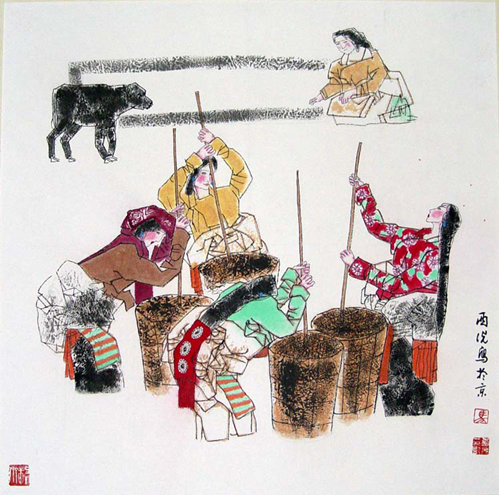 十几个挑着担子的侗族姑娘,从山间小路穿过白色雾纱摇曳而下。这是《山道弯弯》最初的构图。似乎颇有诗情画意,但画来画去却满不是那么一回事。山间小路的曲折和雾的含蓄,尤其是雾,它给现实披上了面纱,使之平添了几分神秘的诗意。诗人艺术家为此创造了多少动人的作品。但在《山道弯弯》中,却发挥不了作用。舞蹈《担鲜藕》独特美妙的舞步节奏,启发我重新思考生活感受,发现原来打动我的不也是这种独特的节奏与动作么?后来删去了行走在弯曲小路上的一大排人,只保留了画面左下方的两个小姑娘,并把她们稍加变化重复出现于画面右上角。着重装饰趣味和节奏的追求。这样画面东西减少了,或者应该说是单纯了,而单纯的画面,却显得丰富。至此我仍舍不得放弃雾的表现,便把后面一组人画的很淡,谁知并未产生雾的含蓄作用,反面削弱了装饰趣味和节奏感。后来把墨色拉近后,总算获得了较好的艺术效果。这样讲,并不意味着“华山自古一条路”。同一题材的处理,必然因人,因画种,甚至因画家的情绪而定。