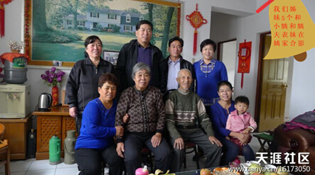 小姨家的陈设,还是停留在上个世纪七八十年代的样子。80多岁的姨夫,从屋里慢慢走了出来,我已经看不出当年的模样,当然印象里一点都没有了。聊了一会后,因为我知道不能在这里和姨共进午餐了,就抓紧和小姨和姨夫家照了一张合影,我们姊妹几个又单独和小姨照了张合影。当我握着小姨的手照相时,我感觉到小姨的手在颤抖,我不知道她平时就这样,还是因为见到了我们激动的原因。