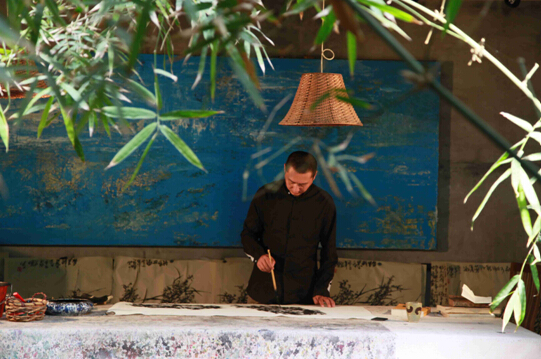 他偶尔往返于澳门和北京郊区,常有随他习武的徒弟和学画的学生一起吃住,其中不乏国际友人。可以想象这样一种生活和创作的状态,空气爽朗,天高山远;与自然亲密同行,朝夕相伴,气质风格深入骨髓;平日所爱的戏谱唱段烂熟于心,信手拈来;白天习武腾挪,晚饭微醺后提起画笔,酣畅淋漓,因此有了他作品的格调。