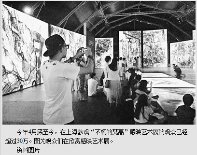 主办方还认为,这次展览是一次尝试,因为在上海是初次采用这样的方式展示大师名作,所以观众有所误解在所难免,只要习惯了这种方式,观众就完全可以自主选择是看真迹还是看“感映”了。其实,从目前逾30万观众的数字可以看出,上海观众还是接受了这种新的展览形式,在这种没有真迹的展览中,享受的就是全新的视觉效果。
