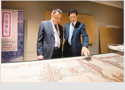 12月8日,“大清世相”展览在澳大利亚国家图书馆举行媒体预展,一幅清代“样式雷”图档亮相,惊艳全场。这幅图档名为《大清门至坤宁宫中一路立样糙底》,2007年入选联合国教科文组织《世界记忆名录》。此次是该图档首次走出国门在国外展出。图为澳大利亚国家图书馆理事会主席瑞安·斯多克斯(右)和首都地区立法会议员克里斯·伯克欣赏图档。