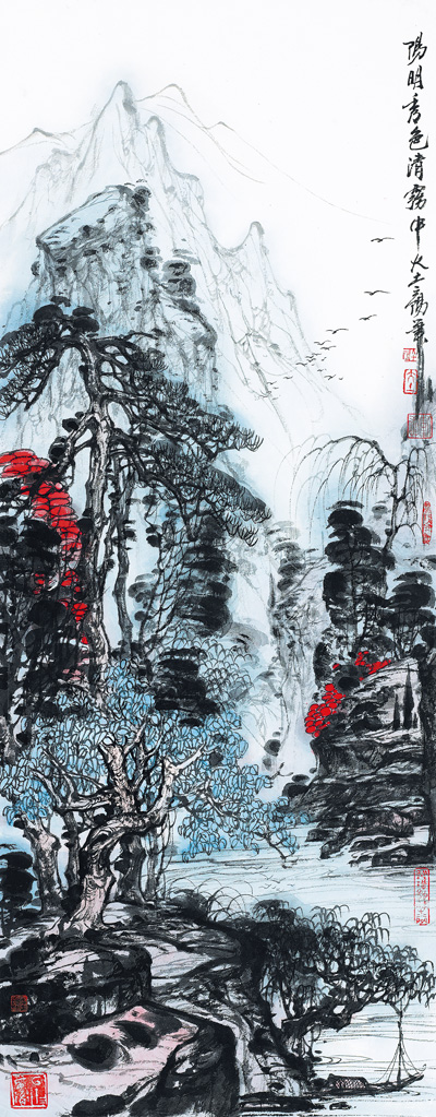 大土三阳的山水画,偏重于自然美。在诗意的大自然里面,把人与自然的关系,特别是人与自然的和谐,把人的精神放到大自然里面去,人的精神在大自然里边栖居,在大自然里边自由地游弋、驰骋。他的画减弱了一些写实性,也减弱了一些写生性。平添了意向性、理想性,表现了画家自己主观感受的诗意的自然美。是大自然的生机和活力,是画家融入大自然里面去的灿烂和充沛,和自由的精神。正因为这样,他不仅从清代的个性派的石涛这些人、上追至明代的沈周……更多的还是宋元。元代像王蒙这种细腻的东西对他影响比较明显,宋代像李成,对他影响也比较大。就是把像石涛、石溪这些人的因素和宋元的因素结合起来,把石涛、石溪的笔墨和宋元的丘壑统一起来。所以,他不光重视笔墨,也重视镜像。特别是画树,我觉得他非常下功夫,把树刻画得非常具体。