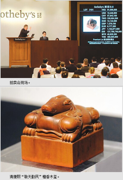 4月6日,在香港举行的苏富比春拍会上,清康熙“敬天勤民”檀香木玺拍出9260万港元,创康熙印玺世界拍卖纪录。