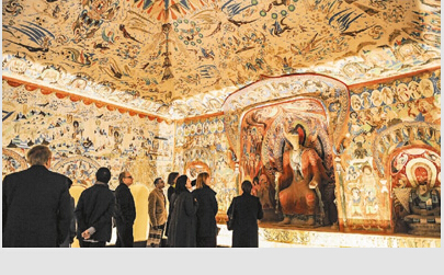 图为观众在展览上欣赏由中国艺术家等比例复制的敦煌石窟艺术。
