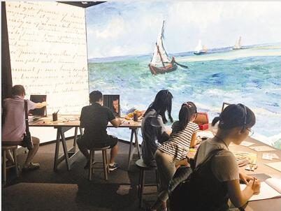 “邂逅梵高”体验展正在北京展出,12日,观众在展览现场临摹。