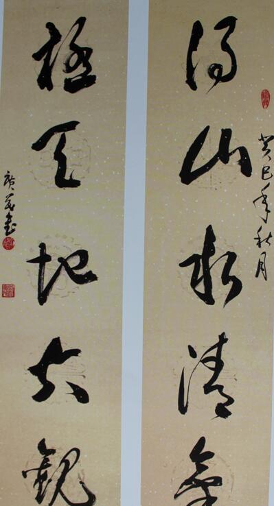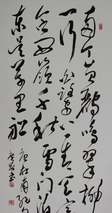 广茂先生书法追求“中和”之美,他的书法有两种形态,阳刚之美和阴柔之美,在他的草书线条中,强调阳刚之美的“骨”、“力”、“势”,同时,在他的章法中又推荐阴柔之美的“韵”、“味”、“趣”。他主张书法艺术以情求神,神采为上,书风以气当先,追求天真纵逸。其草书大气磅礴,变化多端,笔力恣肆狂放、沉着遒劲、神采飘逸。笔画简约,勾连不断,线条流畅纵情,具有审美价值。广茂先生的草书以雄浑奔放的气概、纵横捭阖的笔恣和恣肆浪漫的势态,为学术界所认可。