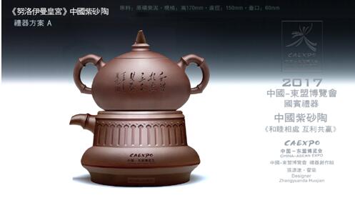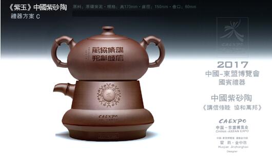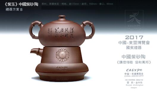 东盟紫砂陶(自流壶)《紫玉》的设计灵感源自1973年春出土,宋代耀州窑出产的青瓷 ——中国唯一的一件青瓷倒流壶。将实用器情趣化、艺术化,亦作为财富权利的象征古来有之。大师们定位东盟国礼要能代表中国的文化和艺术趣向以及广西地区的地域特征, 既是实用器亦为艺术品,更是招待贵宾的礼器及收藏品(记载某时期某事件铭志之物)。国礼的介质为‘’紫砂‘’这个中国独有的工艺,因为它承载了中国几千年的文化,蕴含了人类的智慧,是火的艺术也是生命的艺术。竹,古人谓之紫玉。盛产于广西地区,标志着“东盟”的地域特征,竹,中国人看做君子,意喻东盟国家之间即为君子之盟。 礼器上镌刻“讲信修睦,协和万邦”,草书为张源达书写,隶书由金中浩书写,展现中国独有的书法艺术。